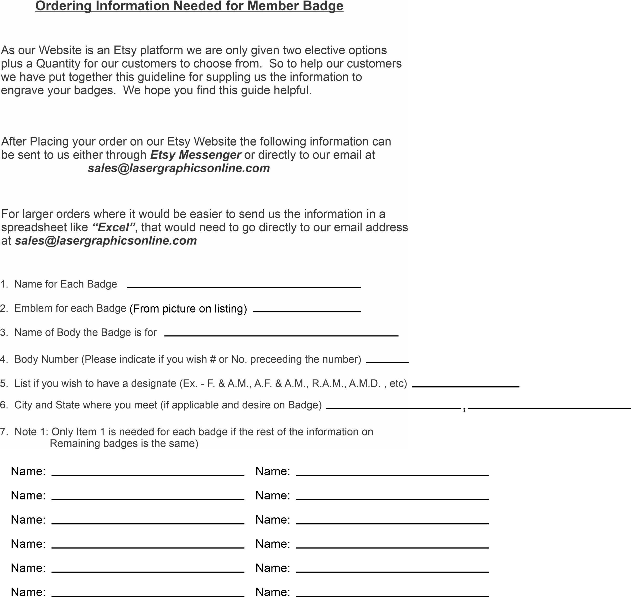 After you make your purchase please look at the bottom of our listing and click on CONTACT US or you can just simply email us the information by sending your personalization info to sales [!at] lasergraphicsonline.com and provide us with the following (please use the pictured badge as a guide)